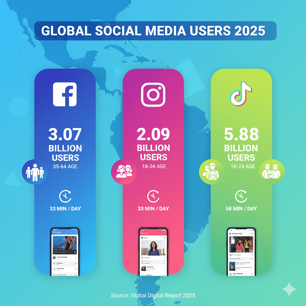Facebook continúa siendo el rey indiscutible en volumen de usuarios con 3.07 mil millones de usuarios activos mensuales a nivel global. En Latinoamérica, su dominio es especialmente relevante para ciertos segmentos.